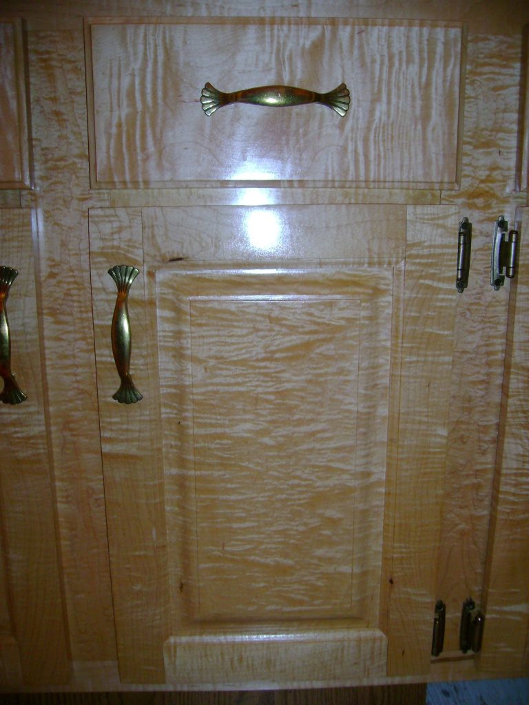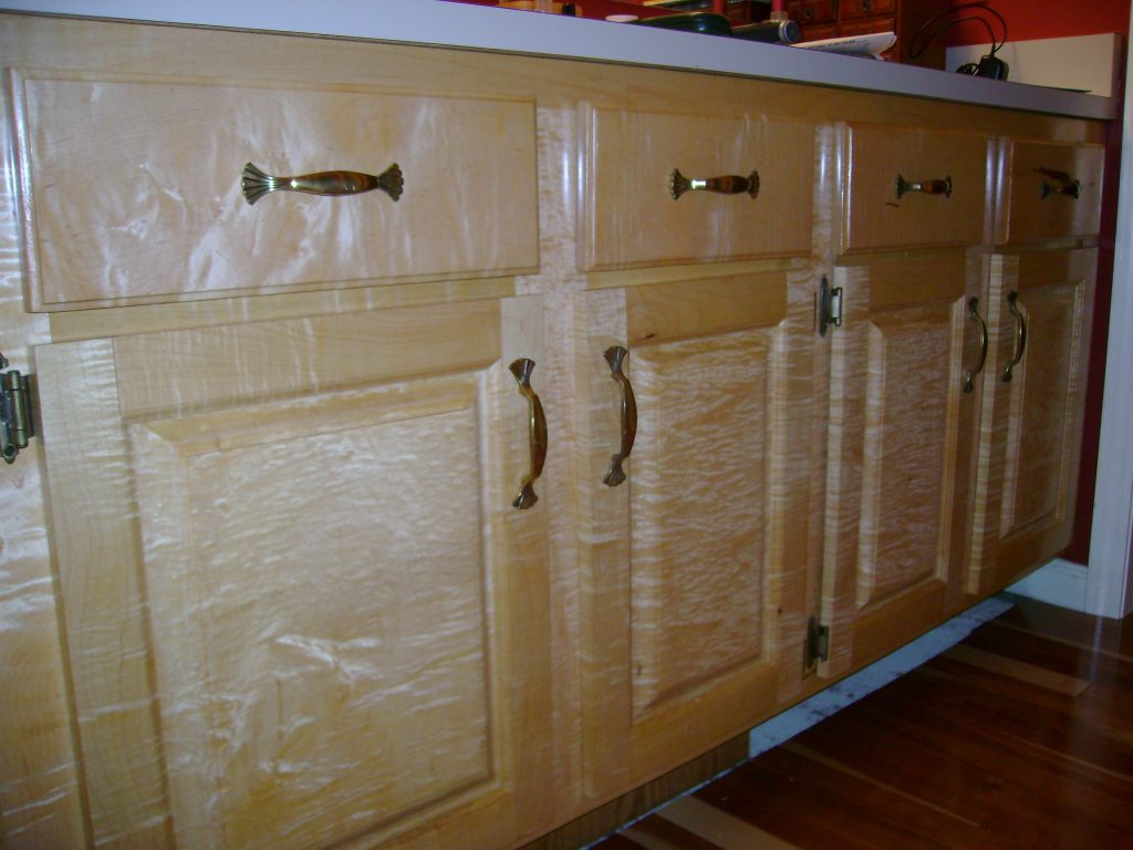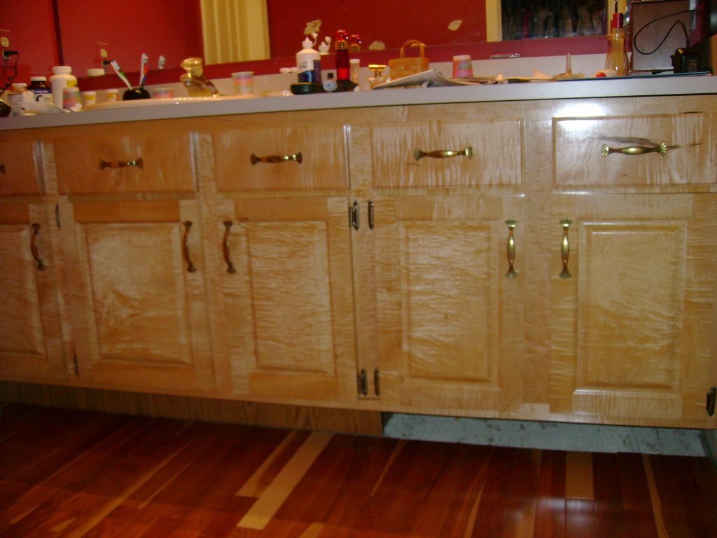 The bathroom vanity in the master bedroom of this house really needed to be replaced but the owner didn’t want to rip everything out, re-do the sink, plumbing, counter top etc. and asked me it I had any ideas. I simply built a new face frame over the existing cabinets, built new doors and installed. This vanity is made out of curly maple. The trick to this project was the finish. Because of the nature of the grain in the curly maple, no ordinary finish will work. I found a recipe using boiled linseed oil, shellac and varnish that makes the character of this wood really pop.