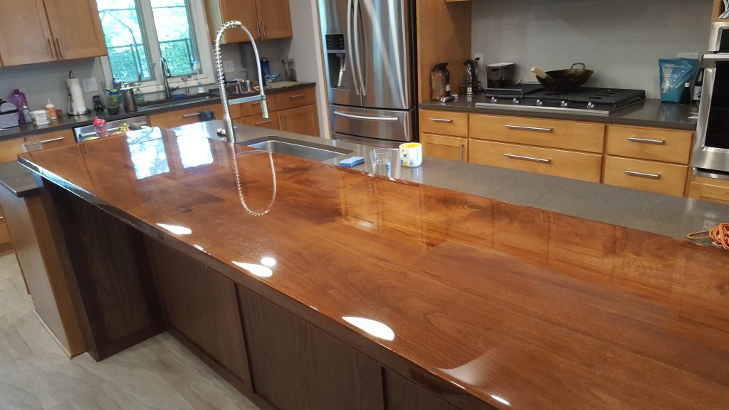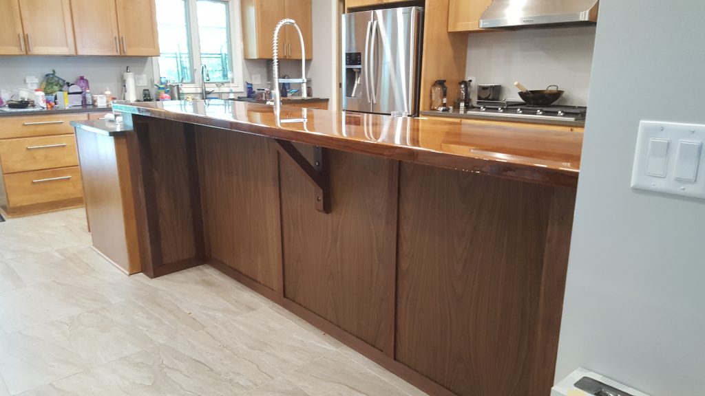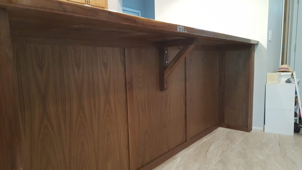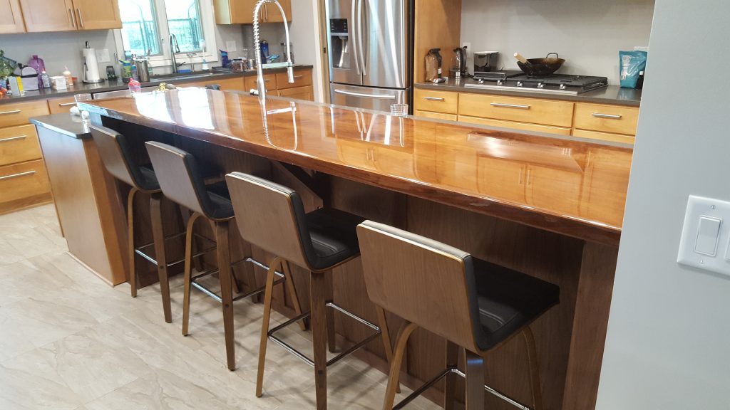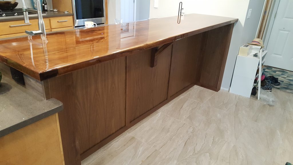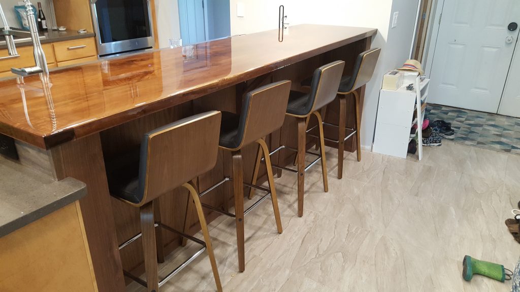 This breakfast bar was phase II of a 3 phase project. Phase I was the rainbow table (https://purplepigwoodshop.com/tables/), phase II was the breakfast bar and phase III, a corner bench. This breakfast bar is (like both other phases) made out of walnut. The top is 9 feet long and 1 3/4 inches thick with an epoxy finish on the top. This project was relativity easy but the epoxy did provide a challenge. I also discovered (which shouldn’t have been a surprise) there there is always SO MUCH to learn about woodworking and I’m looking forward to that.
