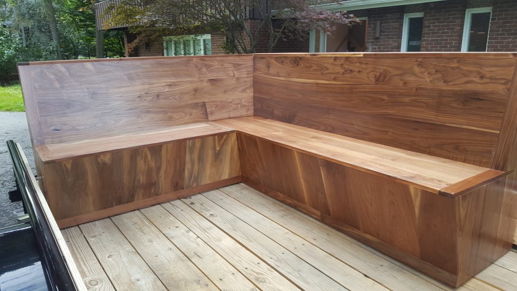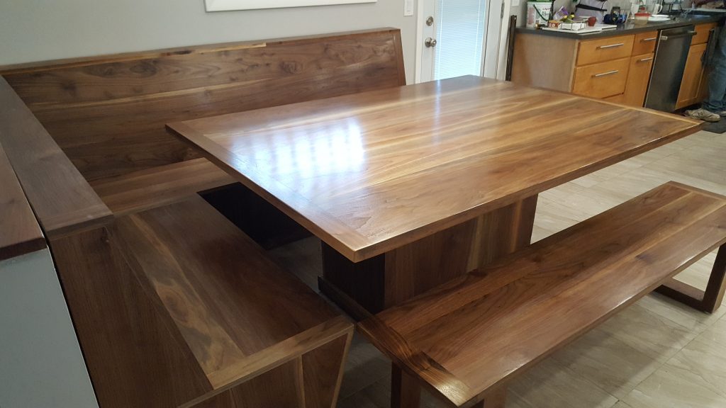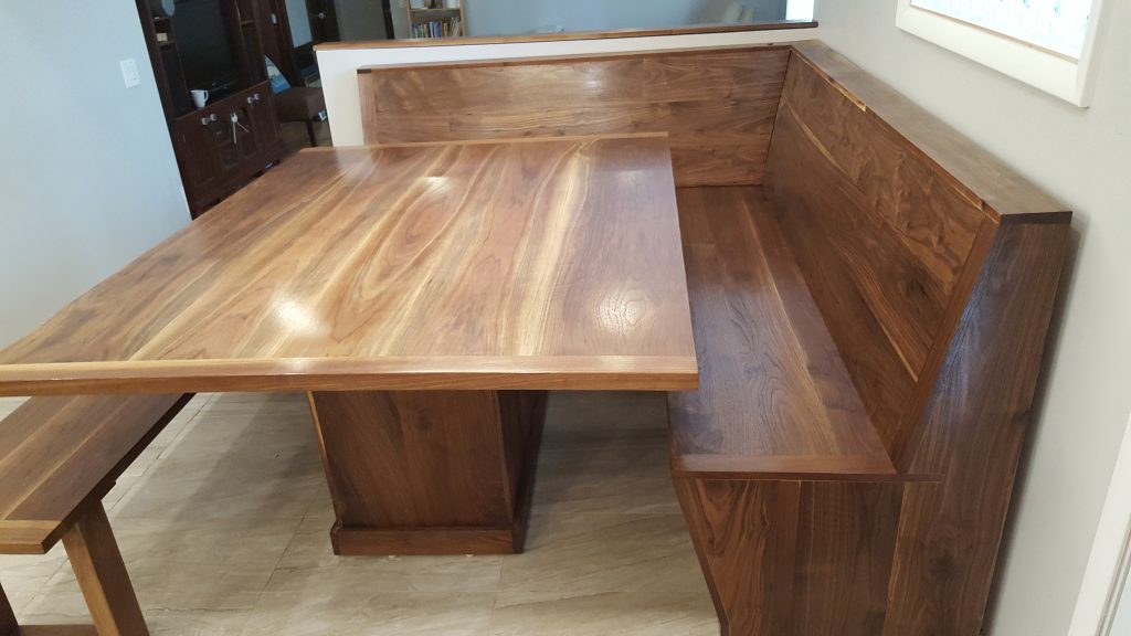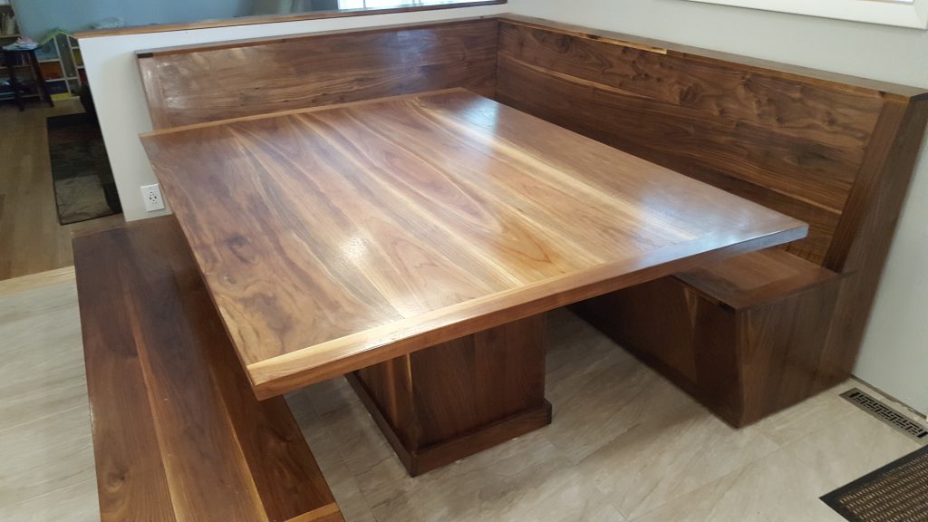 This corner bench was part 3 of a 3 phase project. As with part 1 (the Rainbow Table) and part 2 (Breakfast Bar) the Corner Bench is made from solid walnut. This bench goes around 2 sides of the Rainbow Table. It measures 92 inches long on one side and 75 inches long on the other. The seat is 18 inches high and has an angled kick plate. It’s finished with an oil urethane top coat.