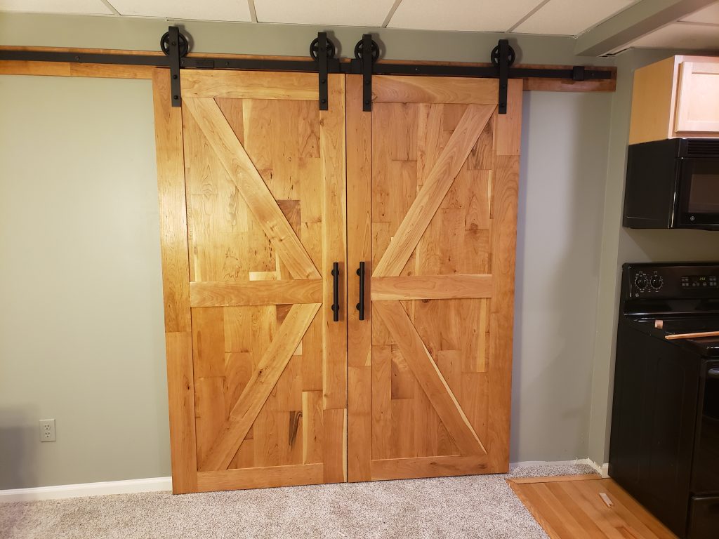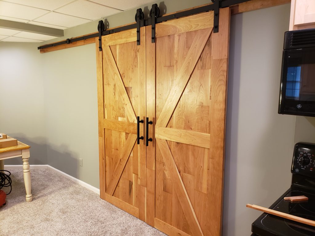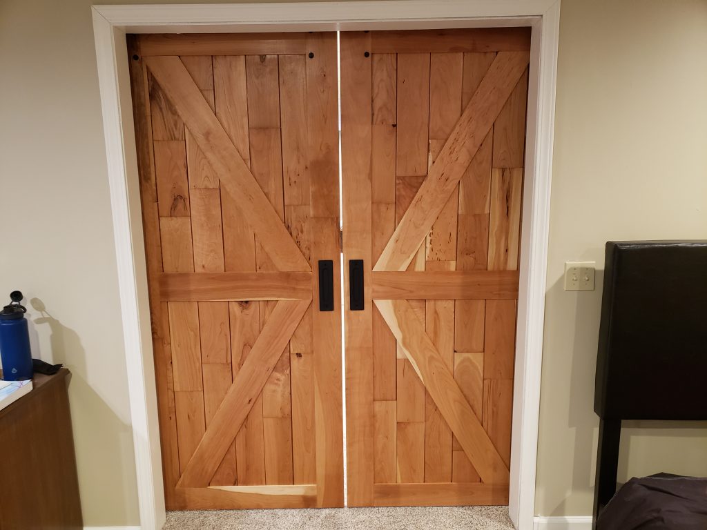Some very close friends of our recently purchased a new house and had the need for some barn doors. I quickly said: “I can do that”. In the house they purchased, the previous owner had left a pile of cherry hard wood flooring. My friends asked if that was of any use and I said: “I can use that for your barn doors”. Well, here’s how they turned out. I hope you like them.