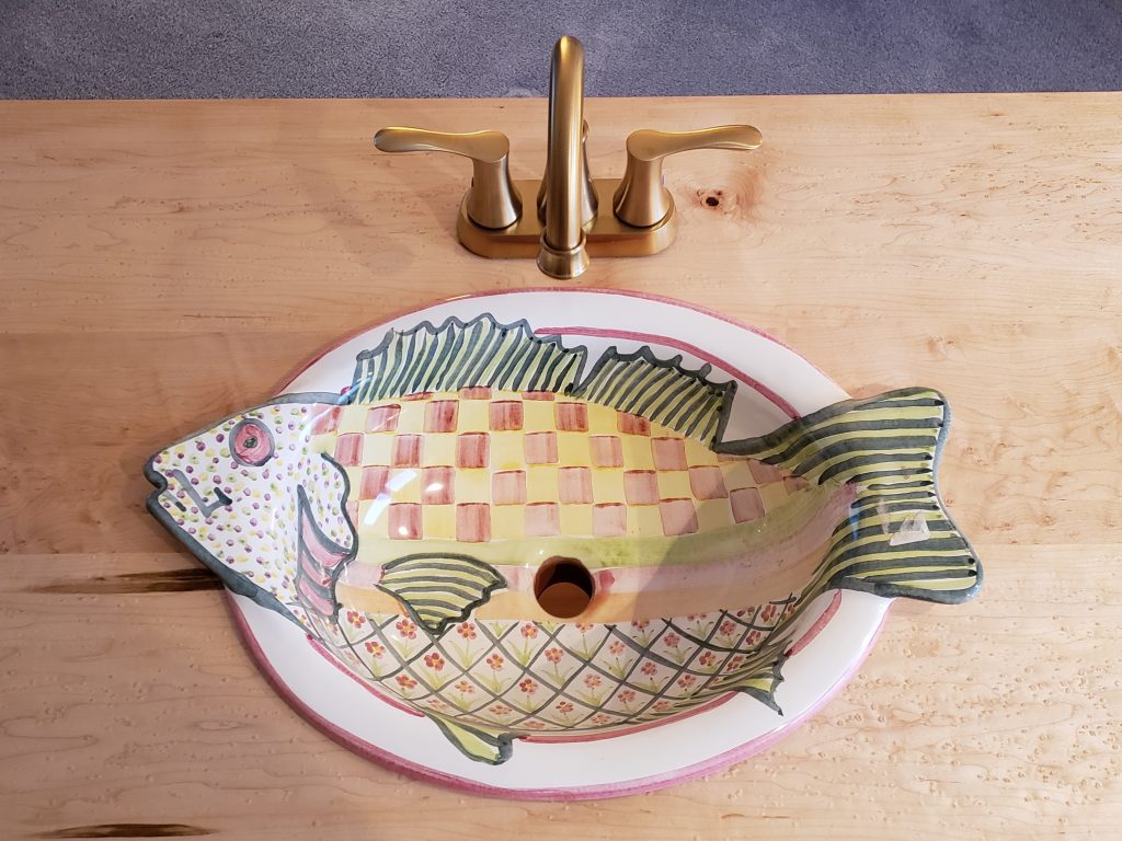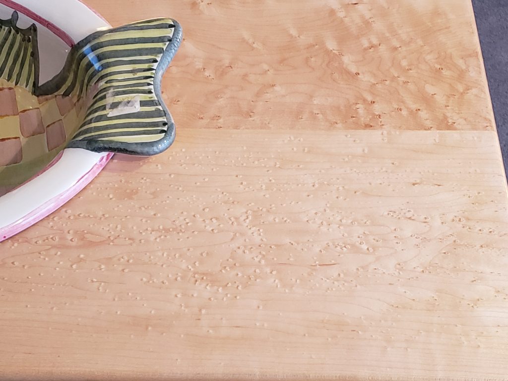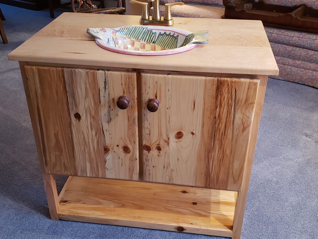 A person I work with (at my other job) purchased a unique sink a while back and was looking for a vanity to use it with. When they couldn’t find one that was the size/style they were looking for, they came to me. Working together, this is what we came up with. The base is made up of some very interesting pine and the top is made from birds eye maple. The base is finished with polyurethane and the top is finished with Odies Oil.