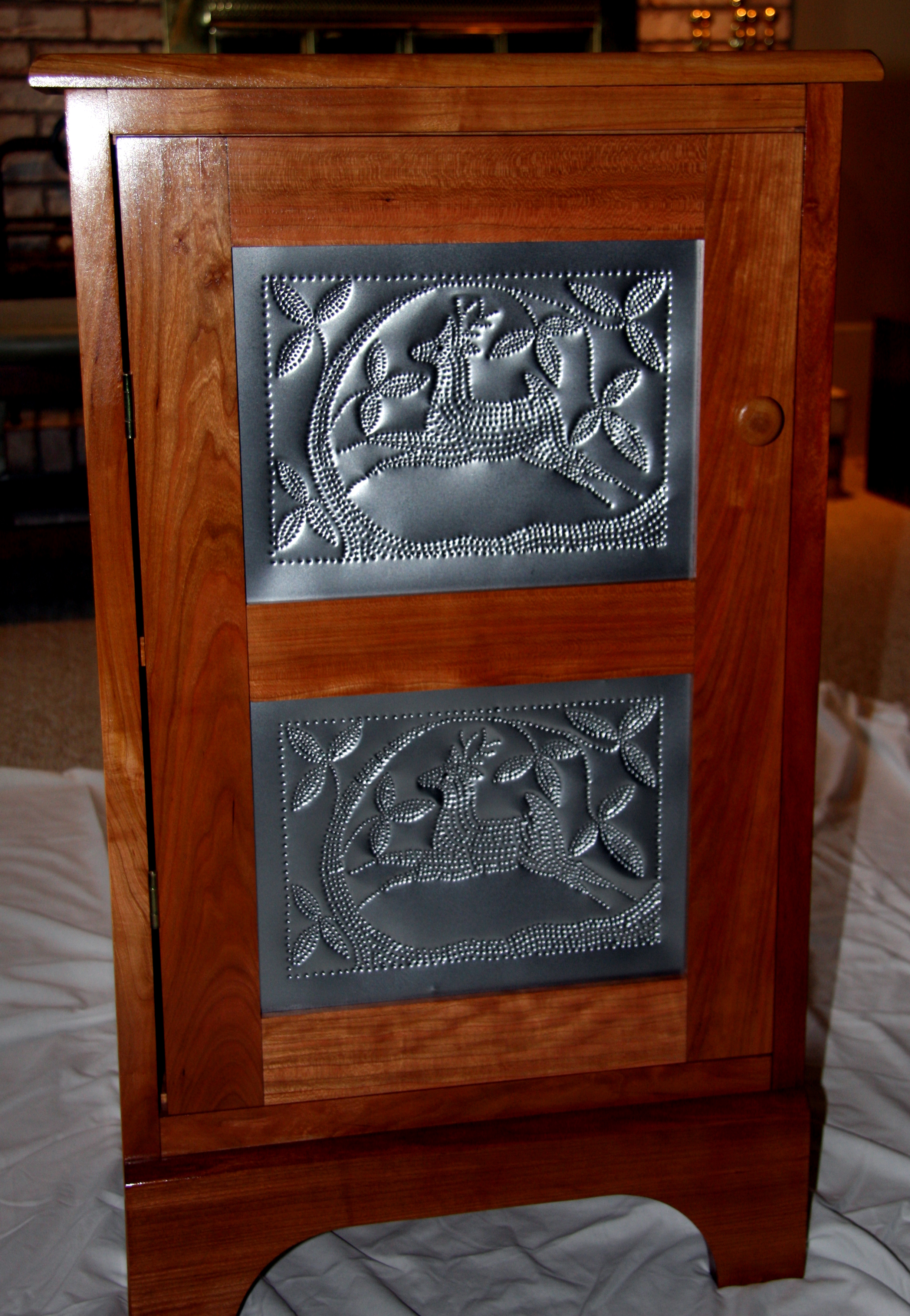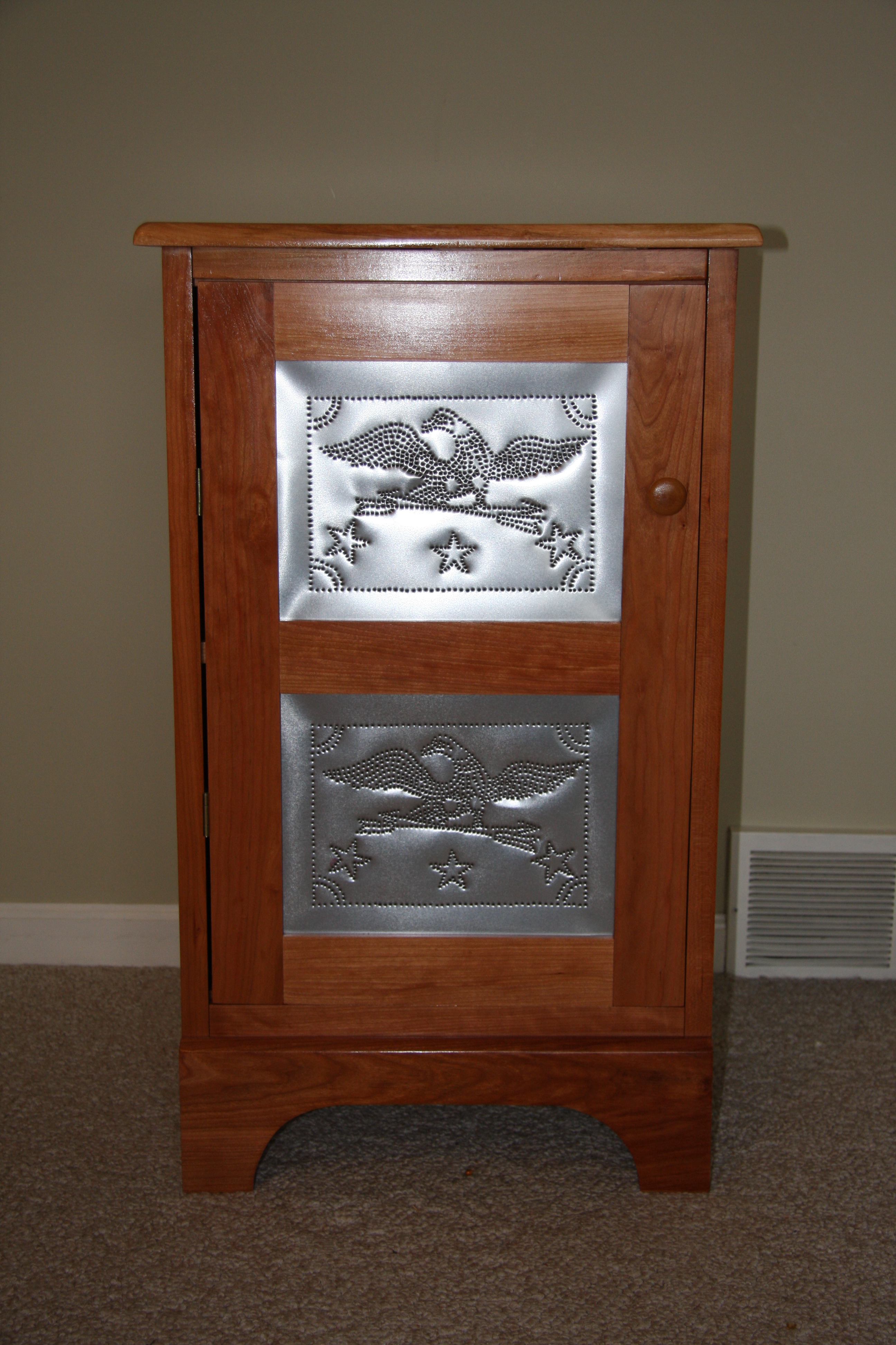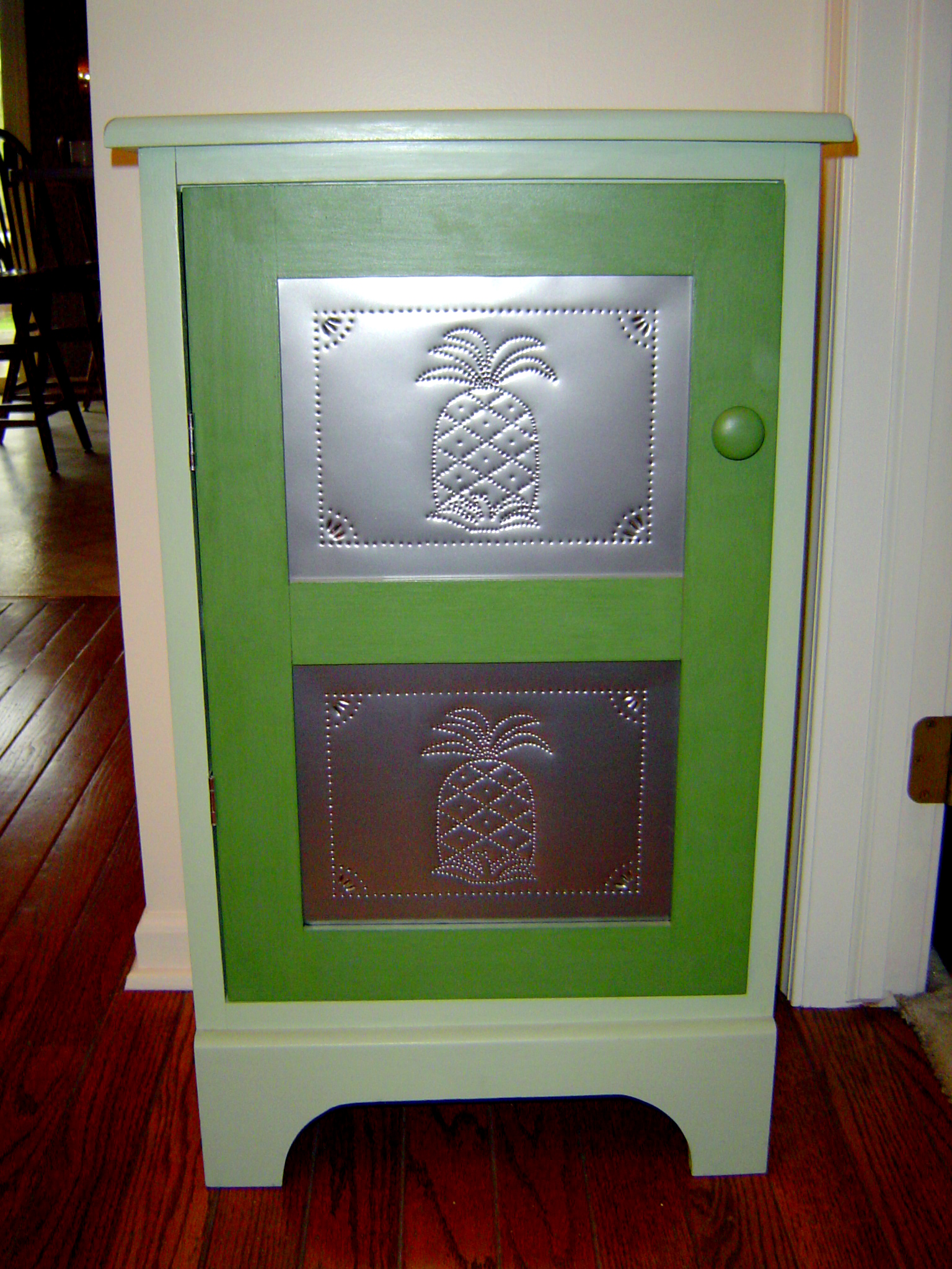 Even if you’ve never made jelly, you can enjoy the attractive accent that a Jelly Cupboard brings to your home. Need a little more storage in your kitchen/dining area? A Jelly Cupboard fits conveniently in that unused corner and offers both storage and just the right size surface for fresh flowers or other accent decor. The Purple Pig Jelly Cupboards feature punched tin panels with a choice of designs.
