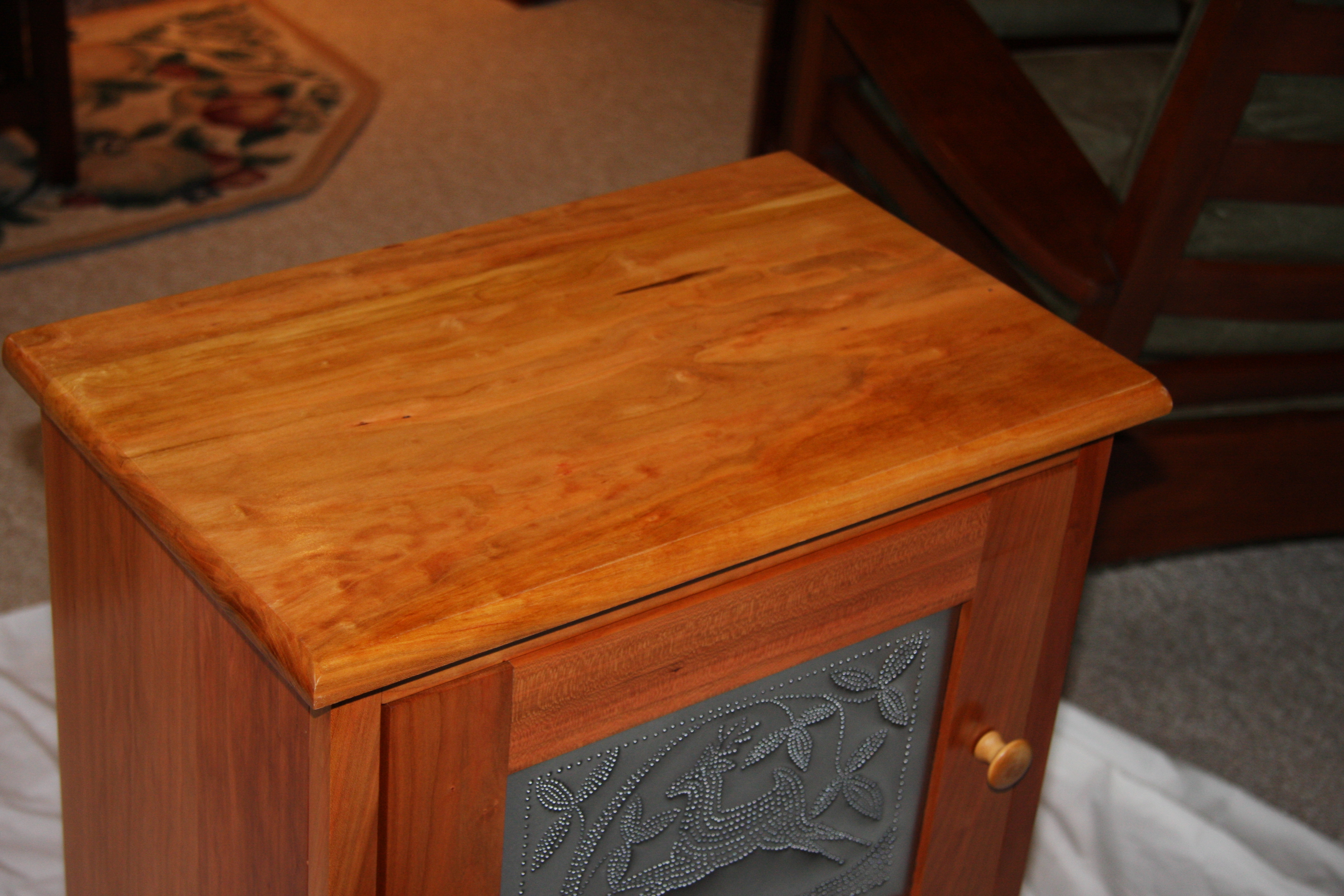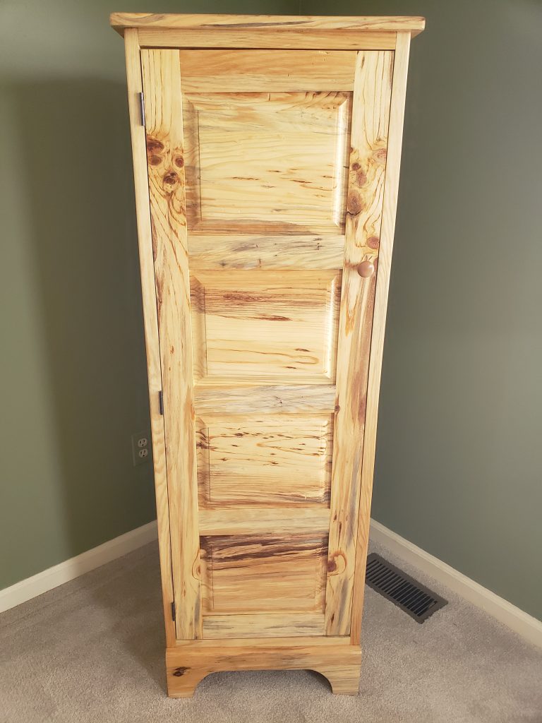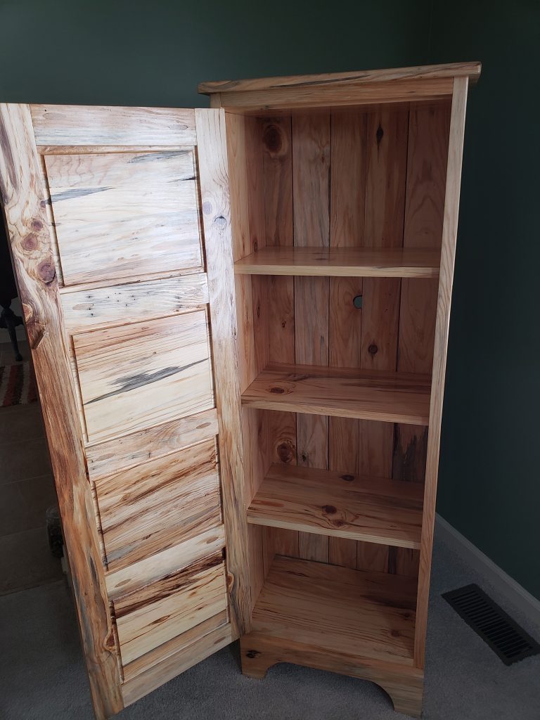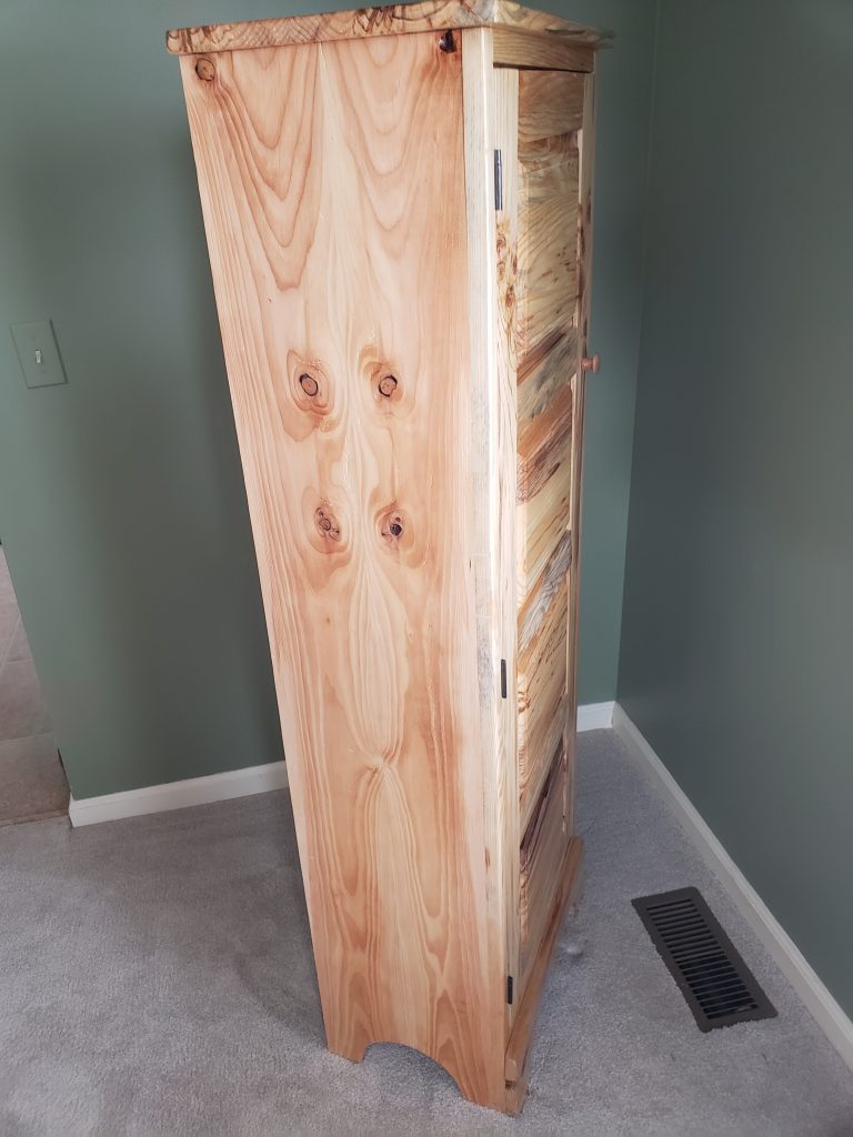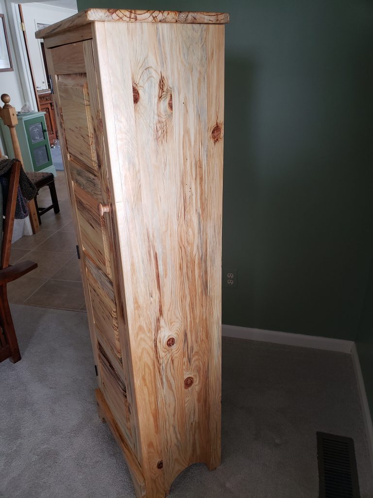 Some friends bought a house that came with a barn. In the barn was a pile of knotty pine boards. I think these boards may have been cut from the property quite a while back (the family room in the house is all knotty pine and the new owners were told that the previous owner did the work on that room). The new owners had no need for the lumber and said either I could have it or they would burn it. There was no way I was going to let a pile (roughly 500 board feet) go up in smoke so I found a spot for (which was not easy). In exchange I told them I would make them something out of that wood. This jelly cupboard is the result. I’m not a big fan of knotty pine but the color in the wood is amazing. This is the same design as other jelly cupboards I’ve built, just taller.