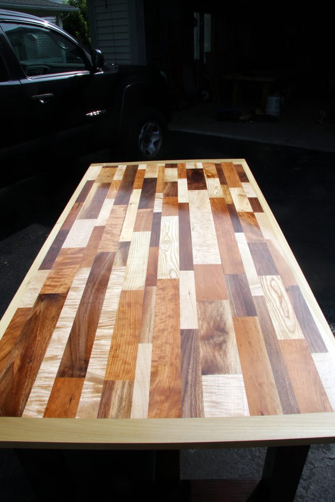 A friend of mine needed a kitchen table but wanted something “different”.  I had a lot of scraps laying around so I put a bunch of them together to make this table.  There are pieces of cherry, maple, walnut, ash, oak and butternut. The legs are made out of 4×4 pine that has been painted black.  The table measures roughly 6 feet long, 3 ½ feet wide and 28 inches high.