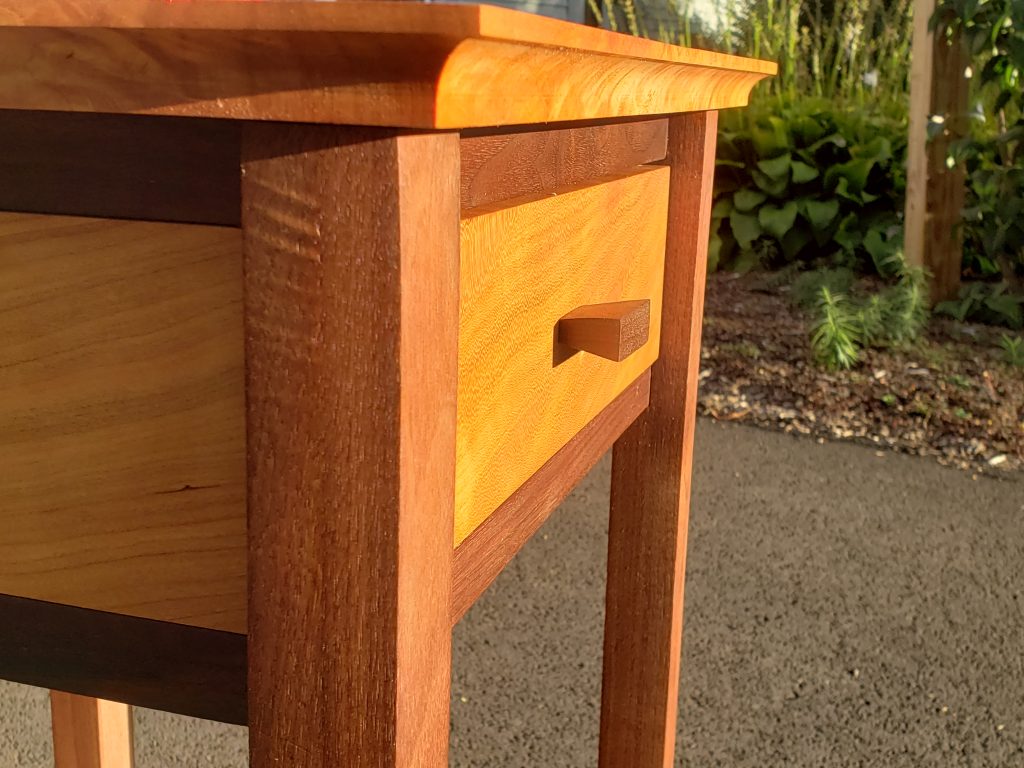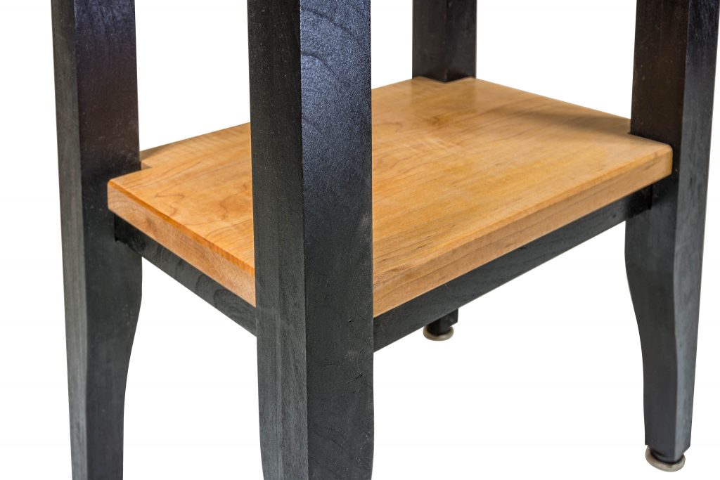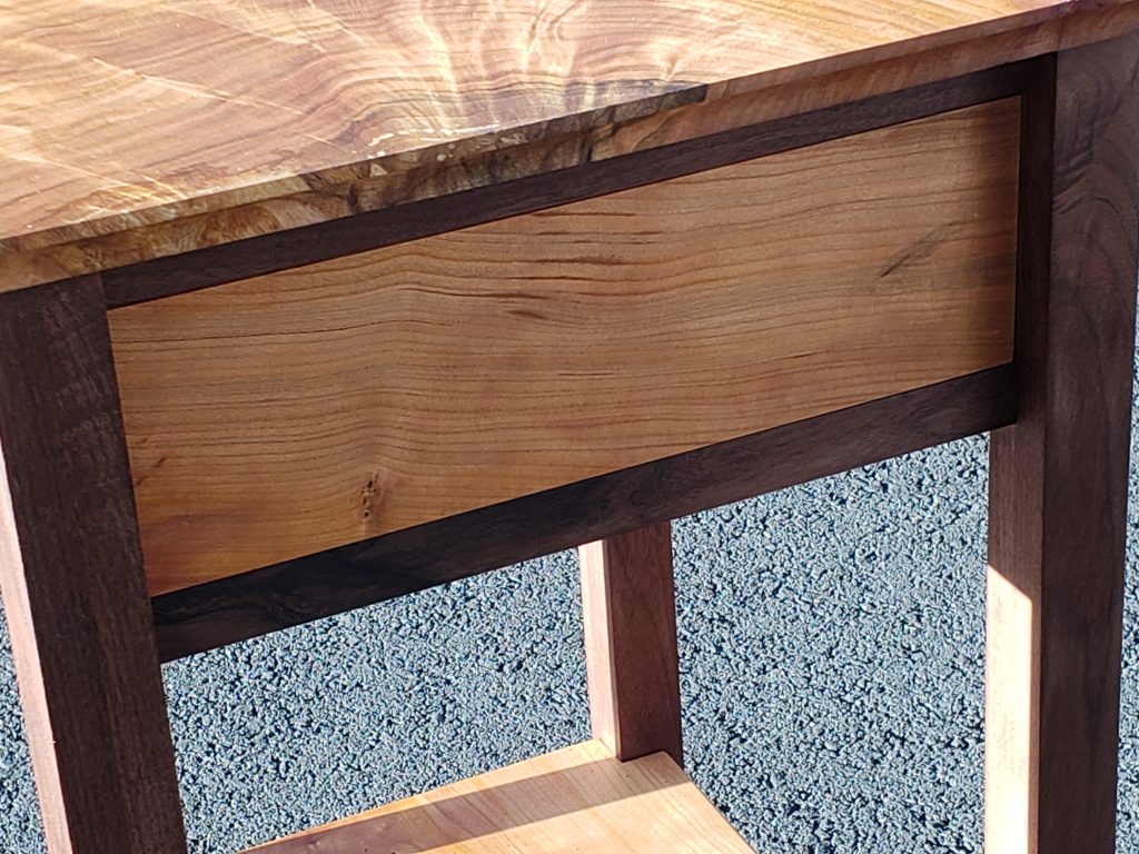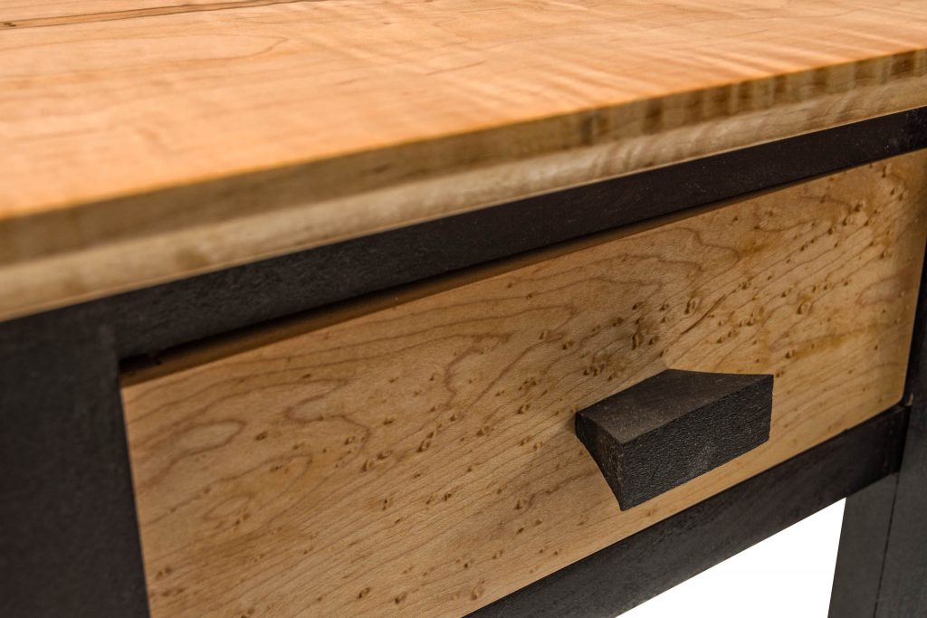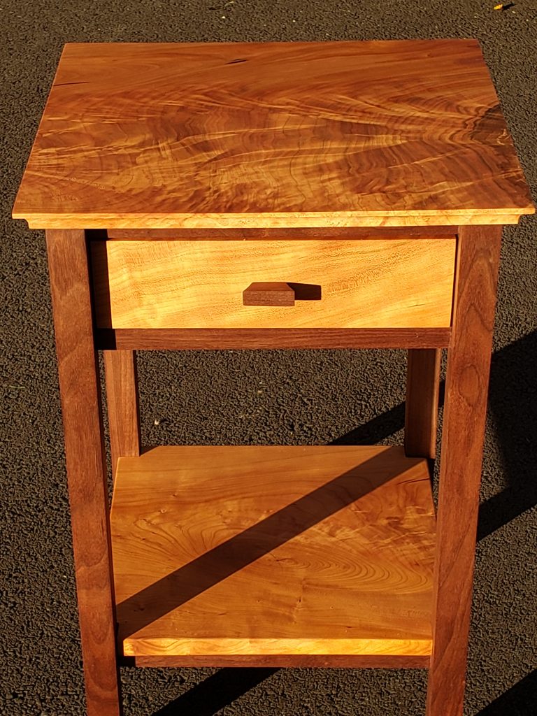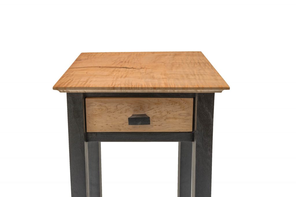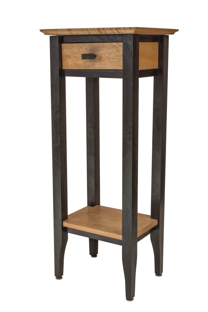 The light-colored wood on the top and shelf of this table is tiger maple, sometimes called striped maple or curly maple. The drawer front is birds eye maple and the black parts are cherry which has been dyed black using India Ink. A somewhat elegant piece. The top of this table is 15 inches wide, 11.5 inches deep and is 36 inches tall. It’s finished with Tung oil.