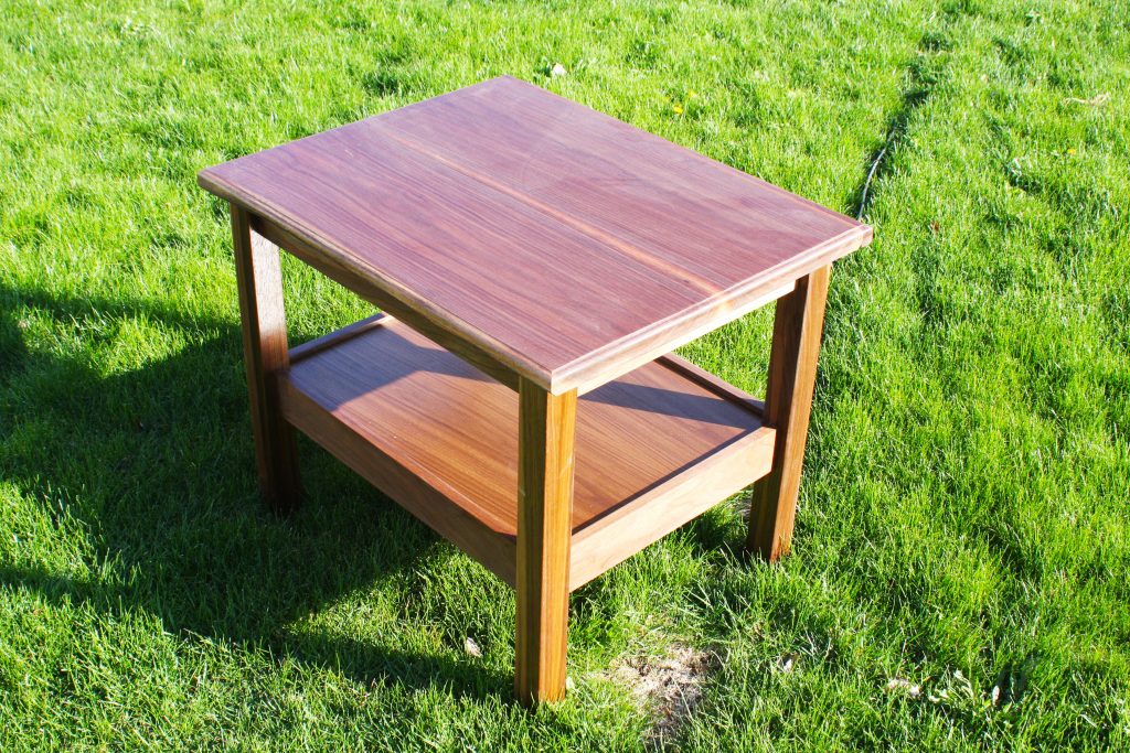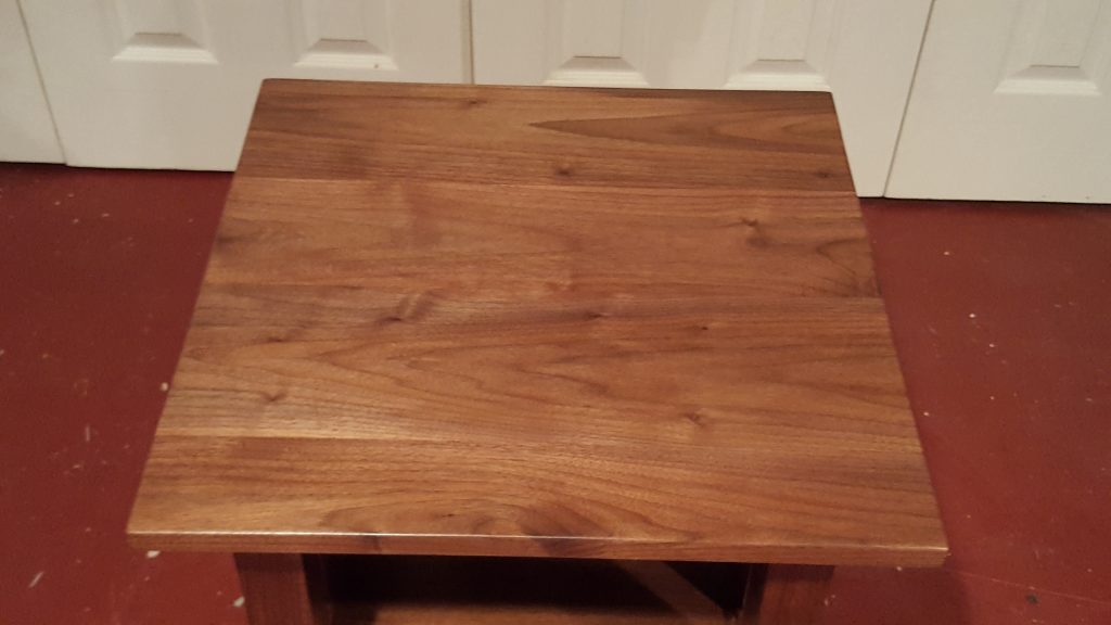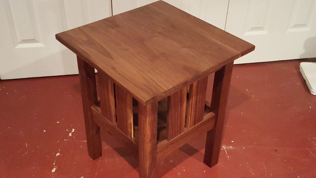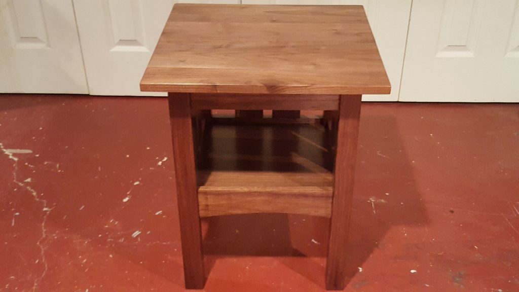 This end table is made of walnut and features mortise and tenon joinery. The top is one solid piece of wood. This piece measures 19 inches by 19 inches and is 22.75 inches tall.