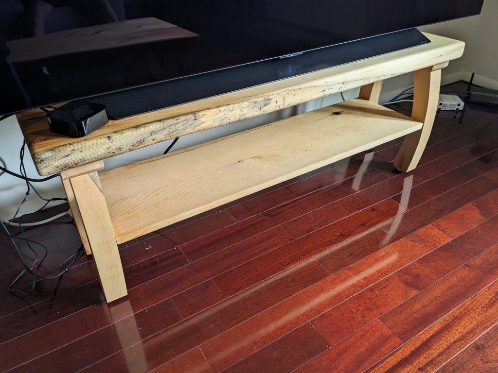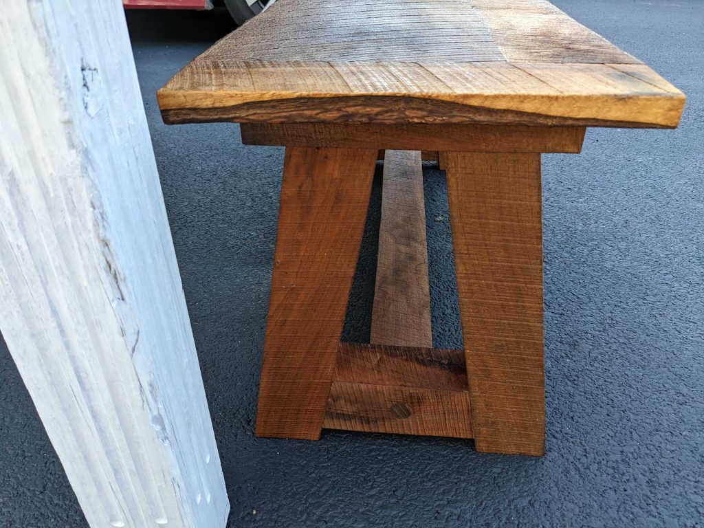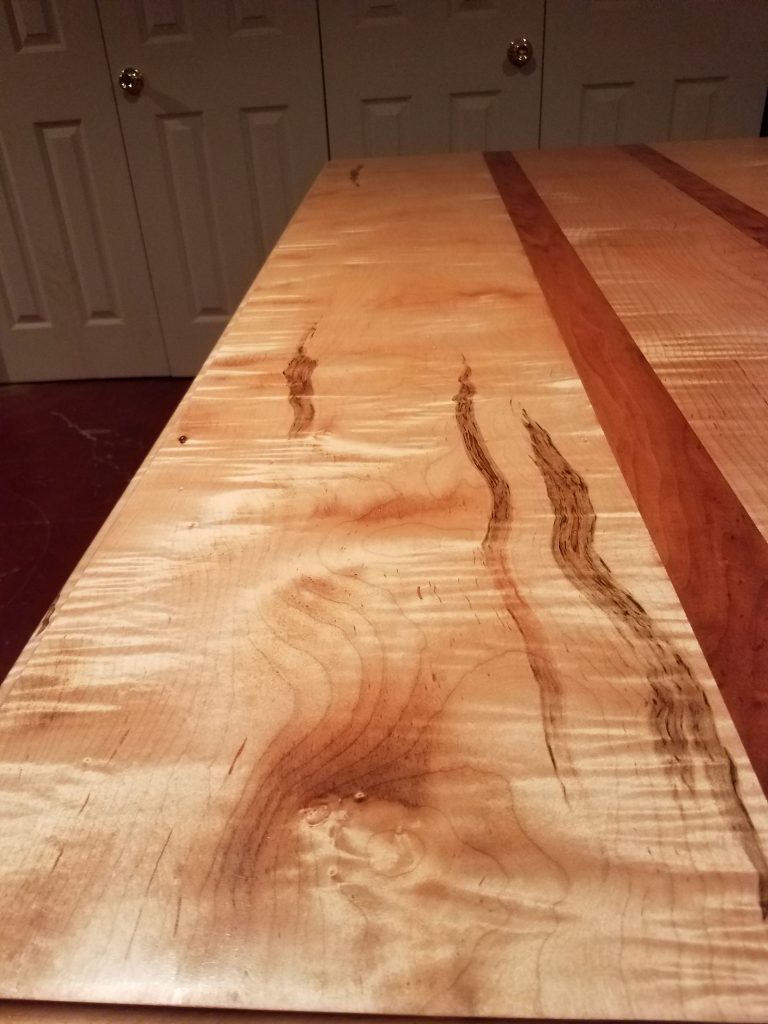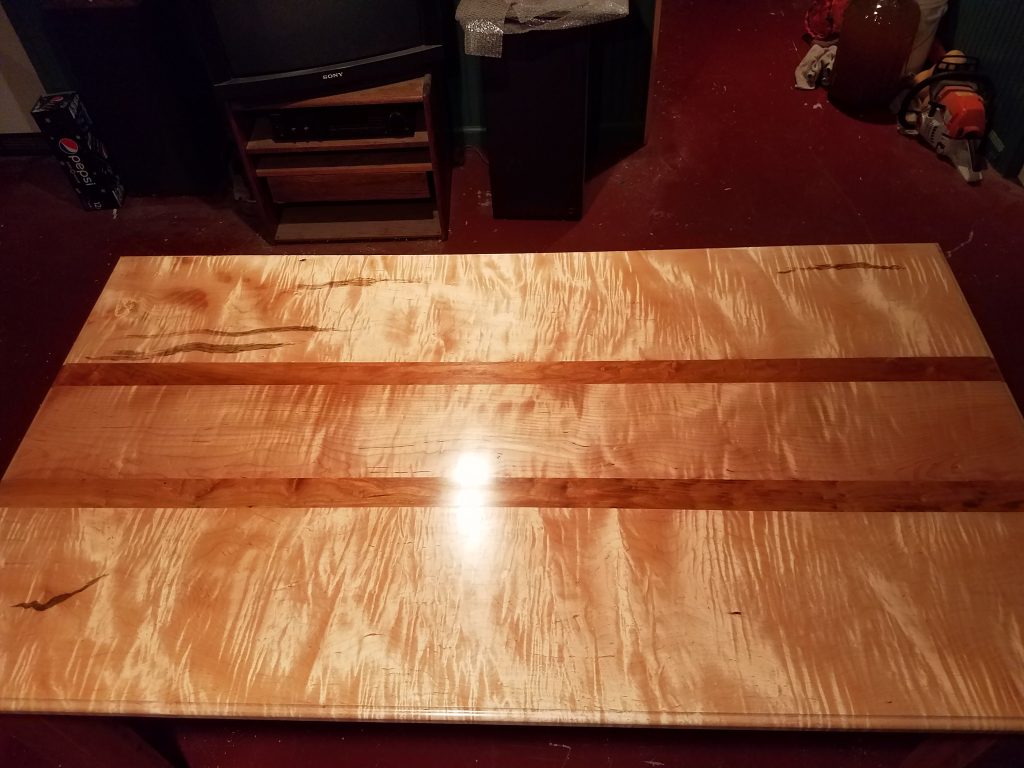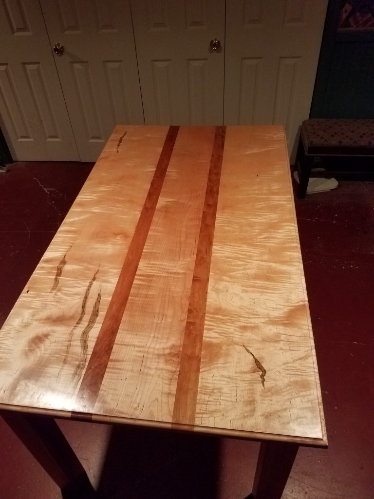 I call this the P&I table after the people I built it for. The top is made of curly maple and cherry. The base is made out of cherry. The 2 outside pieces are from the same board. It measures roughly 60 inches long by 32 inches wide and 32 inches tall. The finish on this was really tough to get right but I’m happy with the results. The stripes of the maple really pop. One friend of mine thought it looked like the ribbon candy we used to get when we were kids.