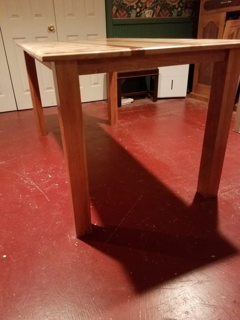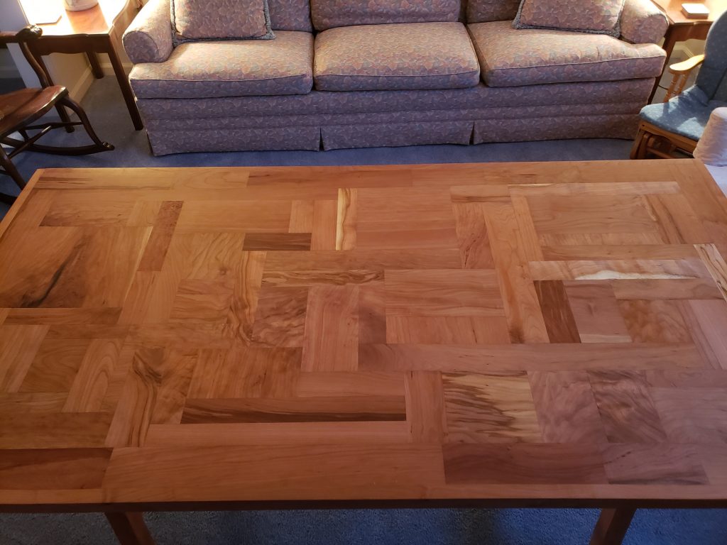 I’m not sure when I made the top to this table. Maybe around 2014 or so? The top is made out of scraps of cherry I had laying around; it was kind of like a big puzzle. I didn’t make any legs for it so it sat around for a while. Actually, I put a cover on it and used it for more surface space in my finishing room. Over time some of the pieces moved (as wood tends to do) and it was no longer flat. Not real bad but not real smooth either. In Dec. of 2021 I sanded the entire surface, taking off the finish and attempting to make it smooth again. It came out better than it was, but my guess is that because there are so many parts involved, it will move again over time. Anyway, when I refinished the top, I also found a design for some legs I really liked. Well, it’s done now, and I hope you like it.