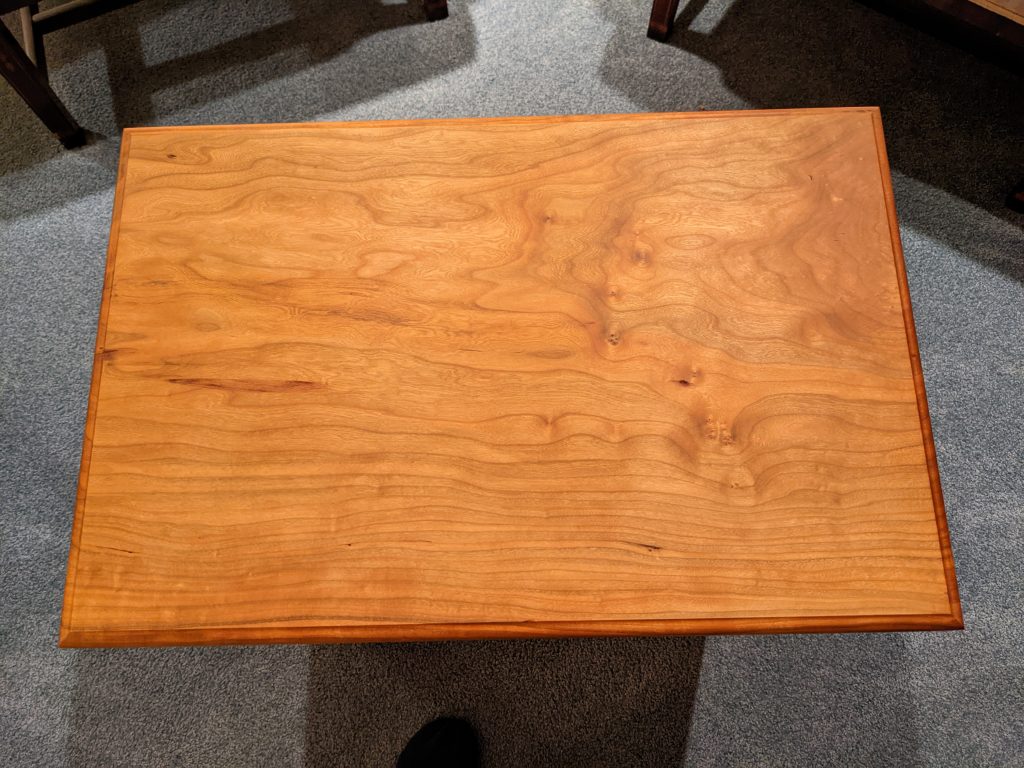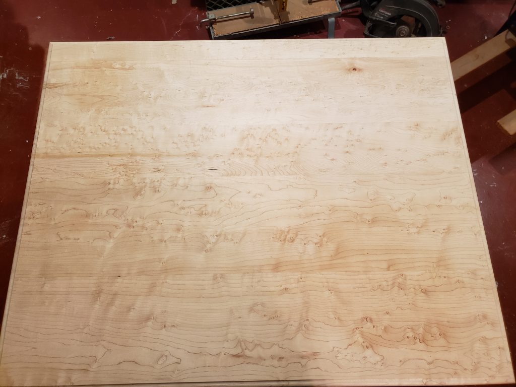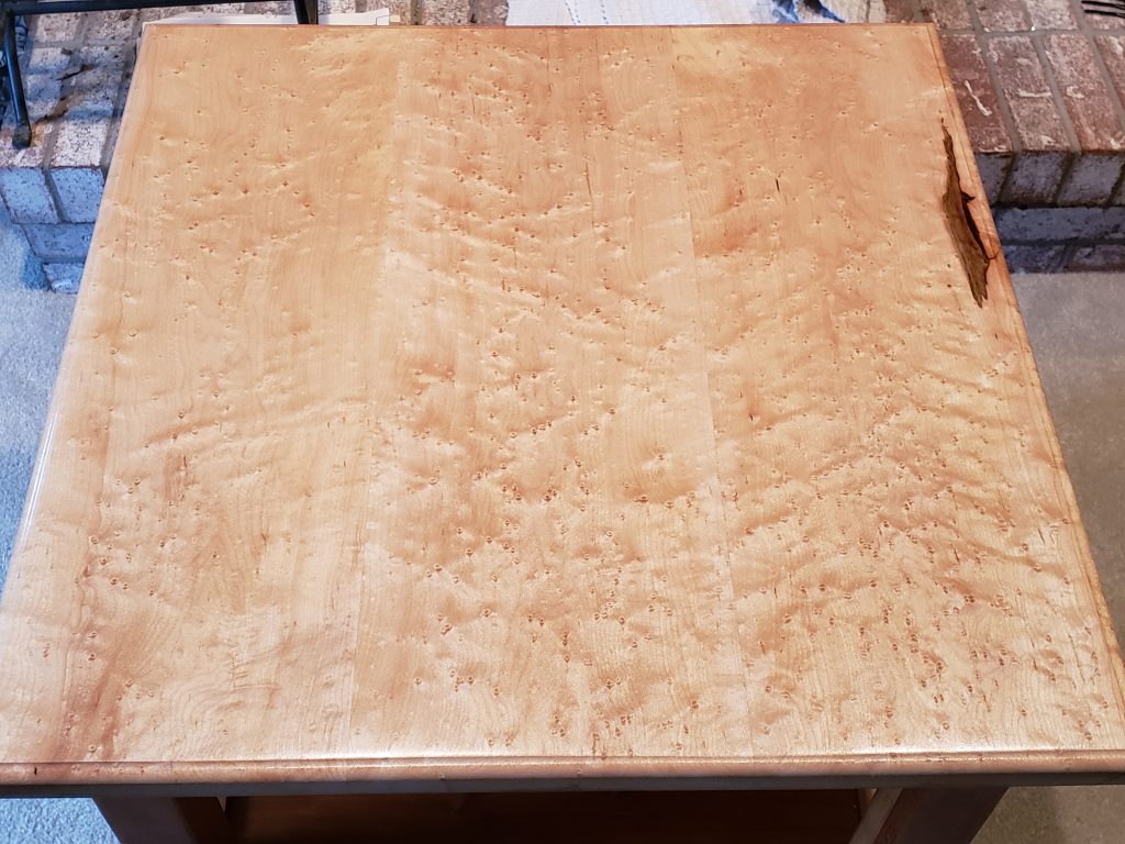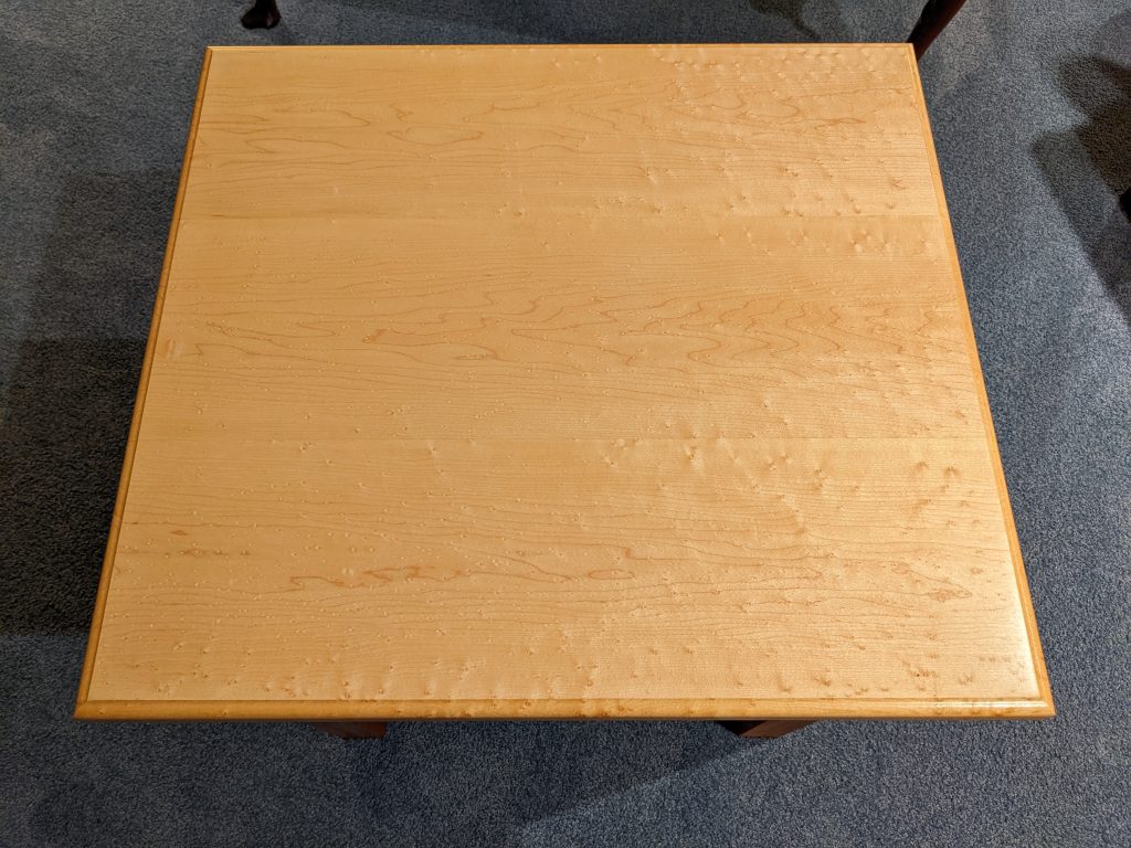 This one has a birds eye maple top with a cherry base and measures 22″ x 24″ and is finished with Tung oil.