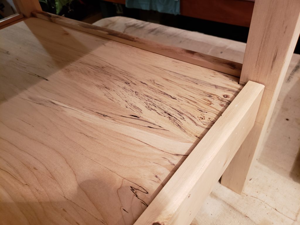 This table has the base made from some very nice splatted maple. The top measures 24″ x 30″ and is made from birds eye maple. This table is finished with Tung oil.