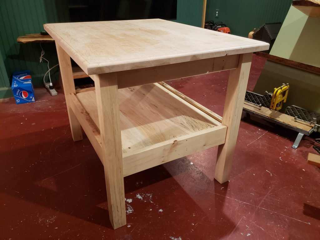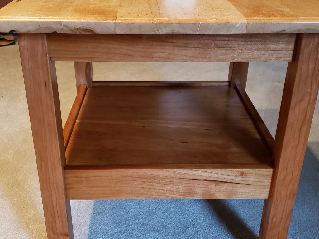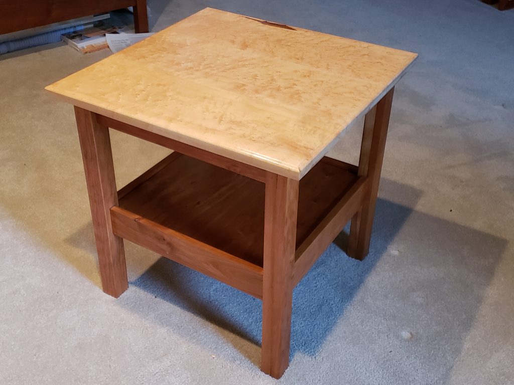 A while back I made a pair of walnut end table for our cousin that was getting married (see walnut end tables below). At the time I cut the pieces for 4 more tables. This is one of those tables. The top is birds eye maple and the legs and shelf are cherry. It measures 24″ x 24″ and is 24″ high.