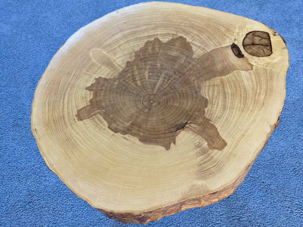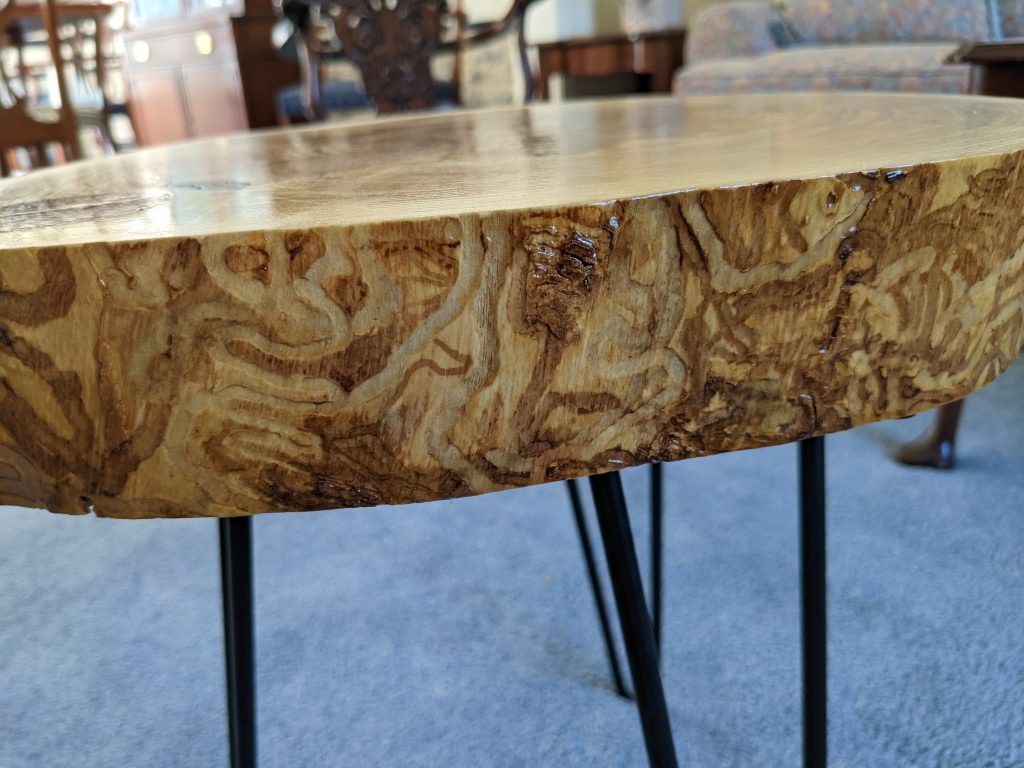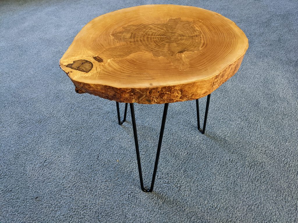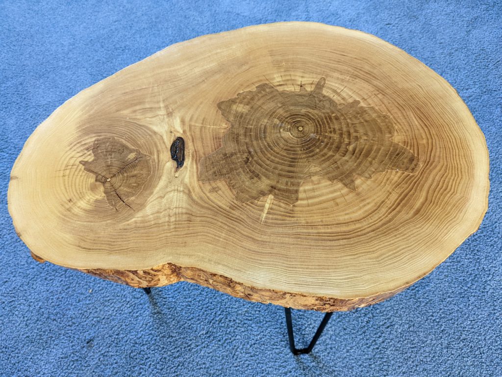 A couple of years ago a customer came to me with 3 wooden “cookies” cut from an ash tree from his yard. For those that don’t know, a wooden cookie is a slice of a log taken horizontally showing the rings of the tree. I immediately sealed these to prevent cracking (something very common when logs are cut this way). The pieces then had to sit and dry which took roughly 2 years. When finally dry, I put several coats of a marine based finish (the kind that’s used on boats) and added some hairpin legs. Here are the results. Note that the real trick to these is getting the sealer on are soon as possible to prevent cracking.