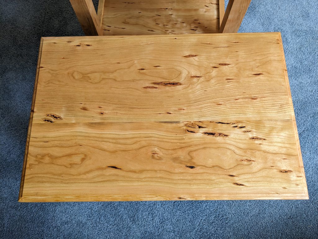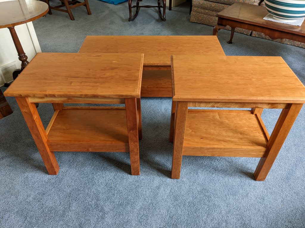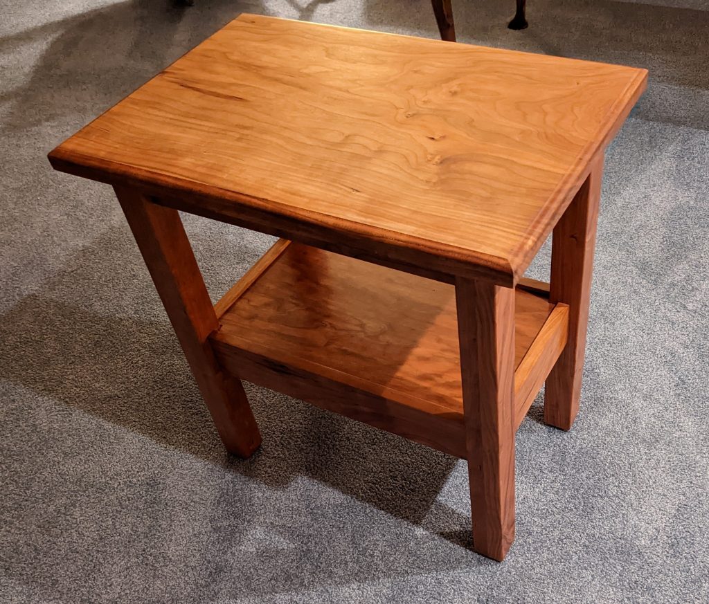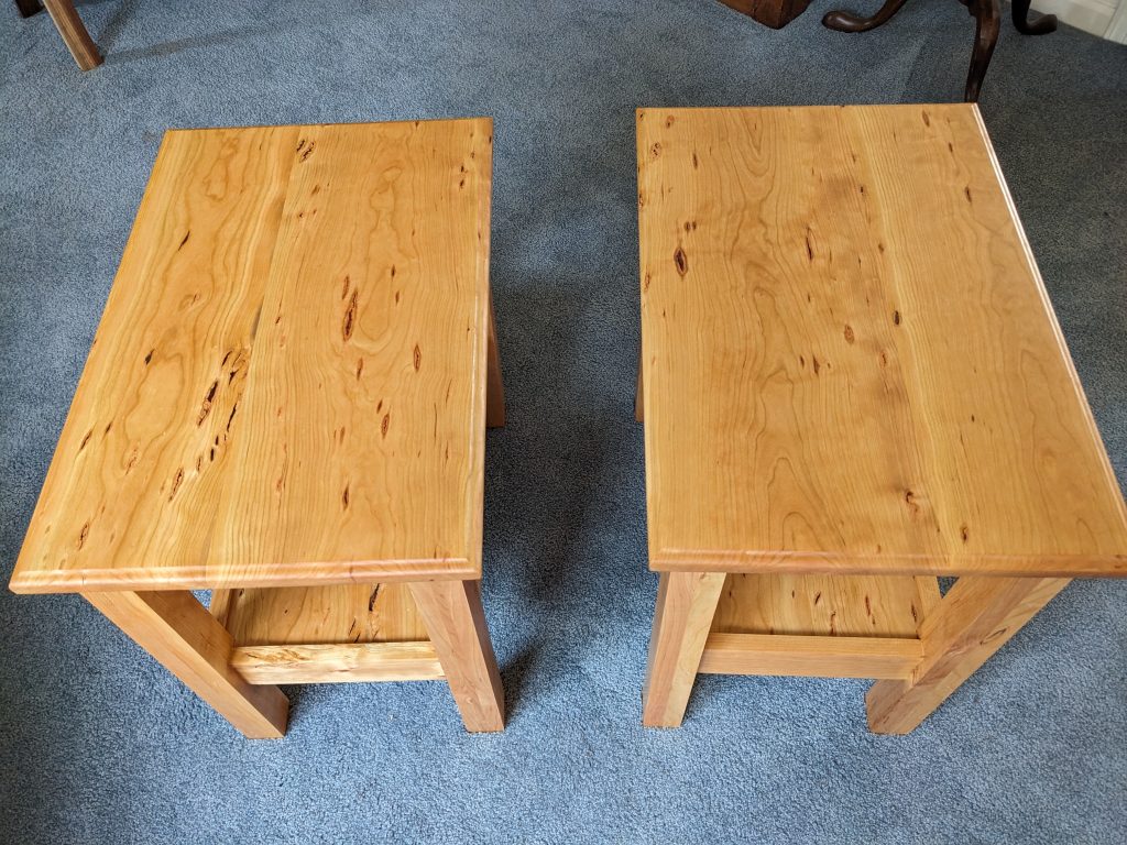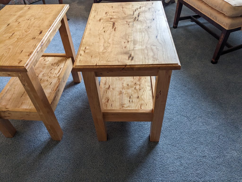 I had a cherry end table on display at Fairport Canal Days (2023) and a gentleman really liked it and wanted me to build him a second one. Well, cherry likes to change color over time so if I build him just one, then they wouldn’t match. So, I built him a matching set. I got the wood for this project from an auction a while back. I’ve never seen cherry look quite like this which (from my point of view) makes these end tables unique.