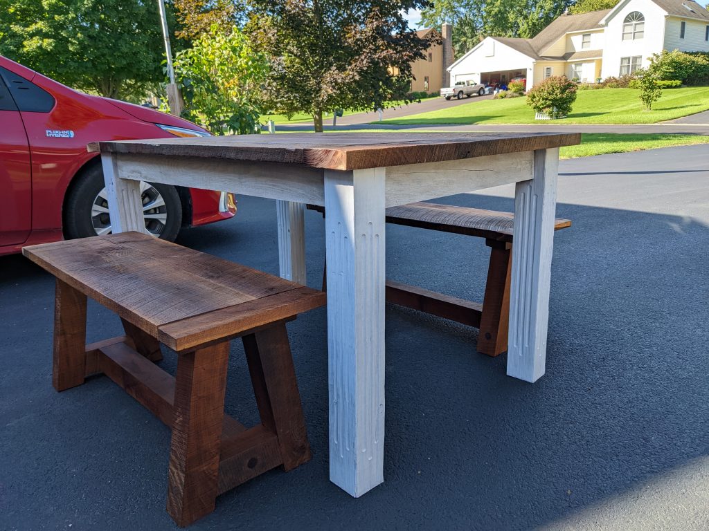 I always wanted to build a farmhouse table made out of barn wood but never did. That was until I met someone at Fairport Canal Days in 2022. They knew just wanted they wanted, and I just happened to have the materials on hand. They wanted a table that was 60 inches long, 36 inches wide and 30 inches high made out of barn wood. They did not want it smooth, they loved knots and cracks. They wanted the base “whitewashed”. After working with them on multiple occasions, this is what we came up with. The pieces for the top were first cleaned with a power washer, then sanded with a flutter sander (sometimes called a mop sander). This softened it up but did not make it flat. The top was then finished with several coats of Tung Oil. The base is made out of pine. It was first sanded smooth, then got a coat of sanding sealer followed by a dark brown (walnut) stain. I then made a 50/50 mixture of water and white paint, applied a coat and immediately wiped off some of that paint with a paper towel (that was a tricky part, didn’t want it to look streaky). I think it came out pretty interesting.