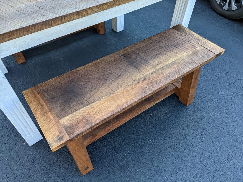 This was a custom order, made with rough cut walnut with whitewashed legs. It measures 54″ long and 36″ wide. Because the wood is all rough cut and not planed smooth, there are many imperfections – just what the customer wanted. I hope you like it as well.