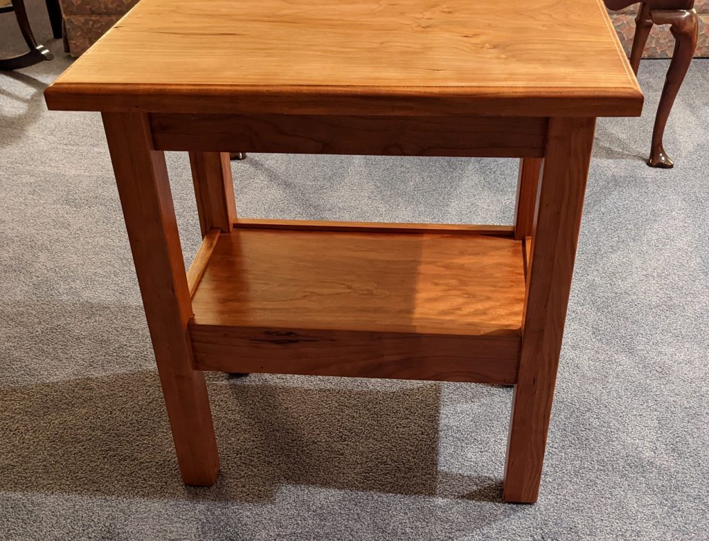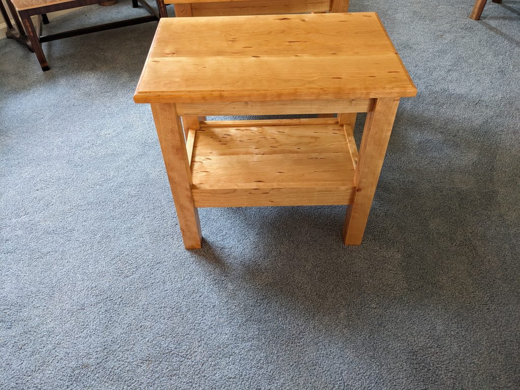 I met some people at the 2022 Fairport Canal Days show and they asked me to build them 2 nightstands and a coffee table, all made out of cherry. They wanted a simple design with each piece having a single shelf. Here are the nightstands (see the “Coffee Tables” page for the coffee tables). The top of this each of these and the shelves came from the same piece of lumber and are solid pieces (not several glued together).